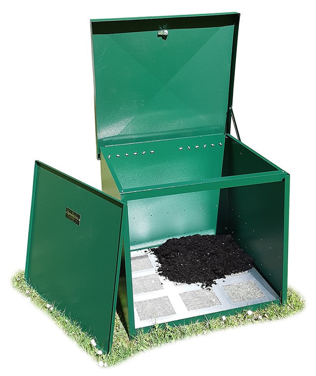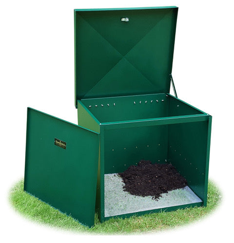 Our flagship composter, the Deluxe model features a hinged lid for convenient addition of materials. Make rich nutritious compost from your kitchen and yard waste! This metal backyard compost bin is designed to keep out rats and to be easy to use.