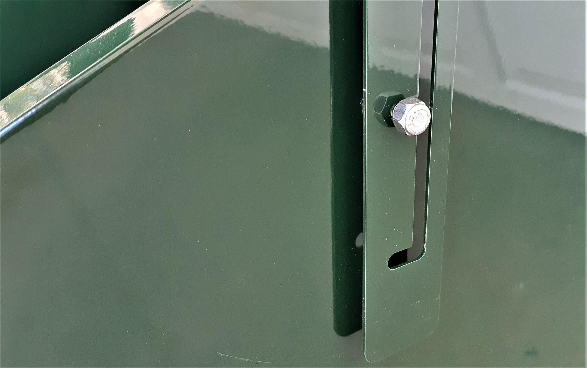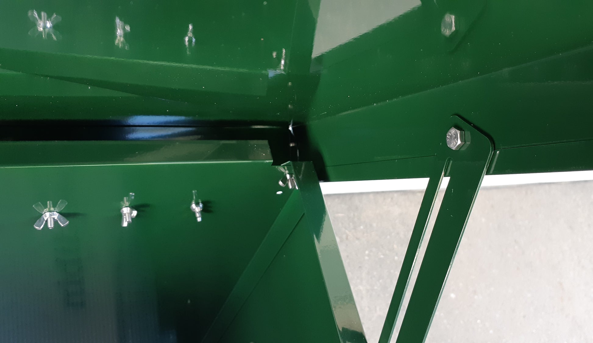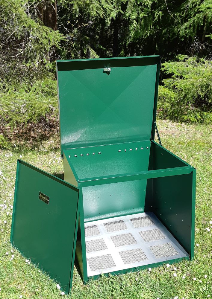 We are actually making a new model, the Merlin, which will be a little to be simpler to fabricate. They will clip together instead of needing bolts and wingnuts. The lid has a pin to hinge on and two integrated support arms, rather than the two hinges with 12 bolts and the one outside support arm. The front door will clip on instead of sliding in channels. So they will be easier to assemble and they will be a little more skookum, too. The design principles are the same, though: no gaps more than ¼ inch so even mice can’t get in, large lid to make forking over easy, removable front door so easy to access finished compost, metal screen on the bottom to preclude tunneling animals, and same large capacity. We think they will be awesome! If that appeals, send us a message and we will add you to the waiting list. Here are a couple of pictures of the prototype: